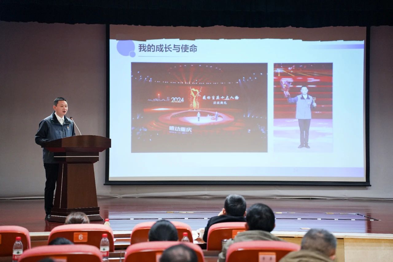 在随后进行的劳模宣讲会上,全国劳动模范、2024年感动重庆年度人物获得者、重庆果园集装箱码头有限公司操作部副部长胡万琪以《创新领航,港口担当:我的成长与使命》为主题,从自身发展经历切入,分享了岗位锻炼、岗位成长、岗位成才的经历,以及创新创效的经验和心得。