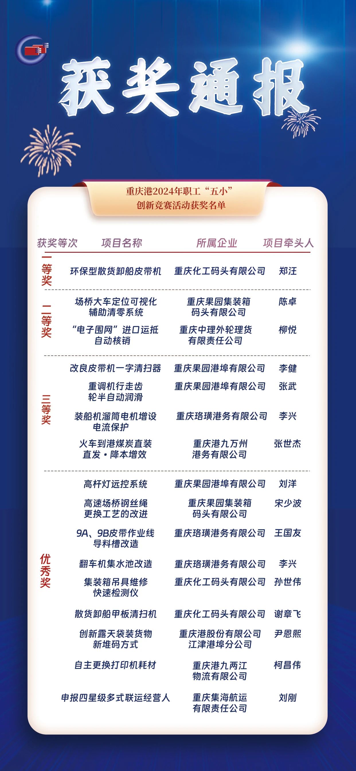 职工在助推企业高质量发展中的创新成效。其中,化码公司“环保型散货卸船皮带机”项目获得一等奖,果园集装箱公司“场桥大车定位可视化辅助清零系统”、外理公司“电子围网”进口运抵自动核销”项目获得二等奖,果园港埠公司“改良皮带机一字清扫器”等4个项目获得三等奖。